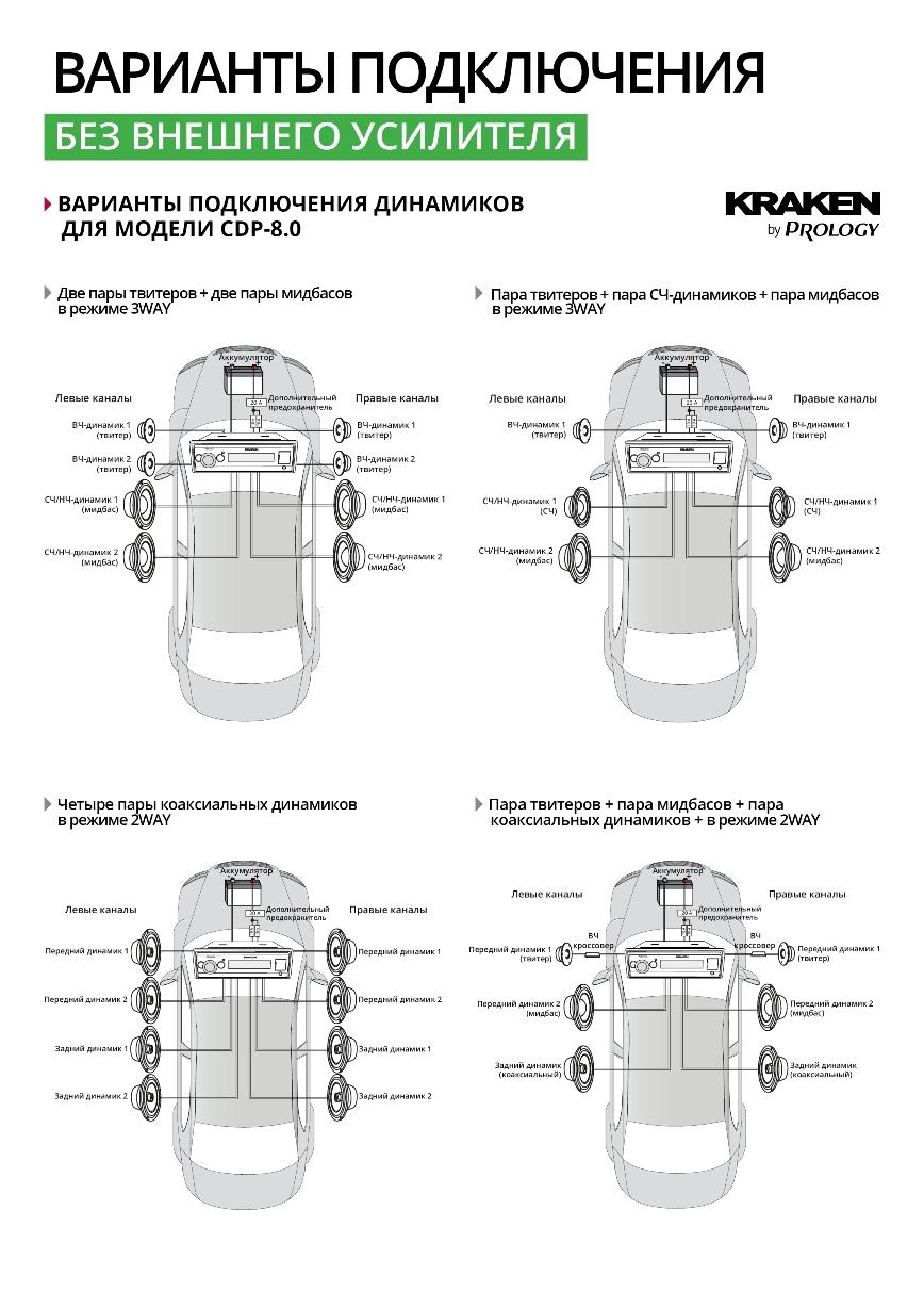 Схемы возможных подключений акустических систем и сабвуферов для магнитол KRAKEN серии CDP с DSP процессорами: Смотреть