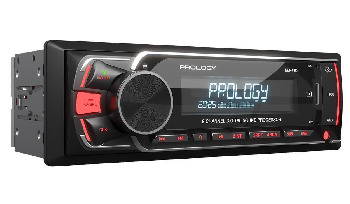 PROLOGY MG-110 — FM/USB/SD ресивер с Bluetooth и встроенным 8-канальным процессором DSP, стандартного размера 1DIN, который обеспечивает прием радиостанций в FM-диапазоне и воспроизведение аудиофайлов форматов MP3, WAV, WMA и FLAC, записанных на USB-накопители или карты памяти microSDXC, передачу звука с внешних источников через линейный аудиовход и беспроводной интерфейс Bluetooth. Поддерживается управление мобильным телефоном через интерфейс Bluetooth 5.1. Устройством можно управлять при помощи мобильного приложения PROLOGY MUSIC, установленного на смартфон с операционной системой Android или iOS.